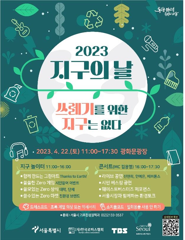 서울시는 22일 '쓰레기를 위한 지구는 없다'란 주제로 4년 만에 야외에서 열리는 이번 행사로 오전 11시부터 오후 4시까지 광화문광장 놀이마당에서 청년, 환경단체, 기업 등 총 31개 부스가 참여하는 '쓸기로운(쓰레기 없이 이로운) 지구놀이터'가 열고 야외 행사와 더불어 17∼30일 온라인 시민참여 이벤트 '제로서울 챌린지'를 한다고 하니 동참해보자고요