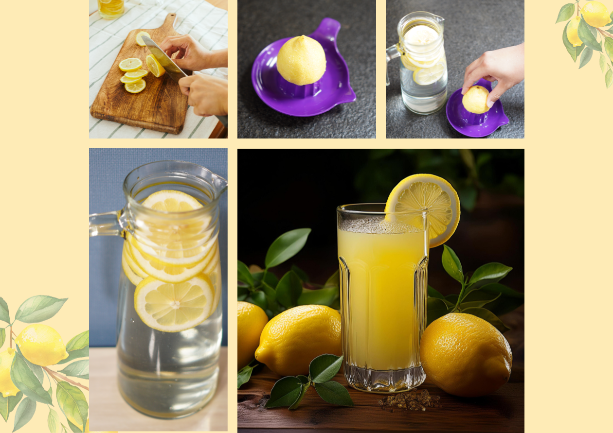 3. 물과 섞기: 큰 유리잔이나 통에 물을 붓고, 짠 레몬즙과 슬라이스한 레몬을 넣어주세요 이때 그냥 물로 먹기
