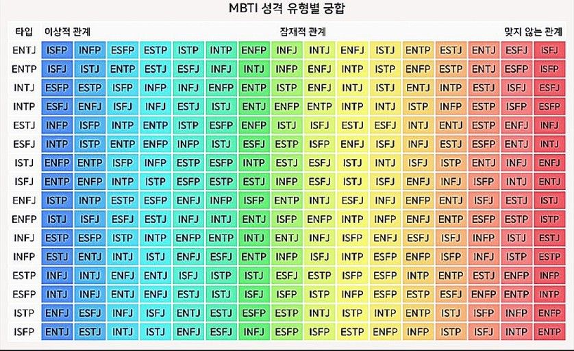 궁합을 시각적으로 이해하려면 MBTI 궁합표를 참고해보세요. 이런 표는 어떤 유형끼리 잘 맞는지 또는 갈등을 겪기 쉬운지를 한눈에 보여줍니다. 예를 들어, NF 유형(감정적, 이상주의적)은 종종 SJ 유형(현실적, 안정적)과 성향 차이로 충돌하기 쉽다고 해요. 하지만 궁합표는 참고자료일 뿐이며, 실제 관계는 대화와 노력에 따라 얼마든지 달라질 수 있다는 점을 기억하세요.