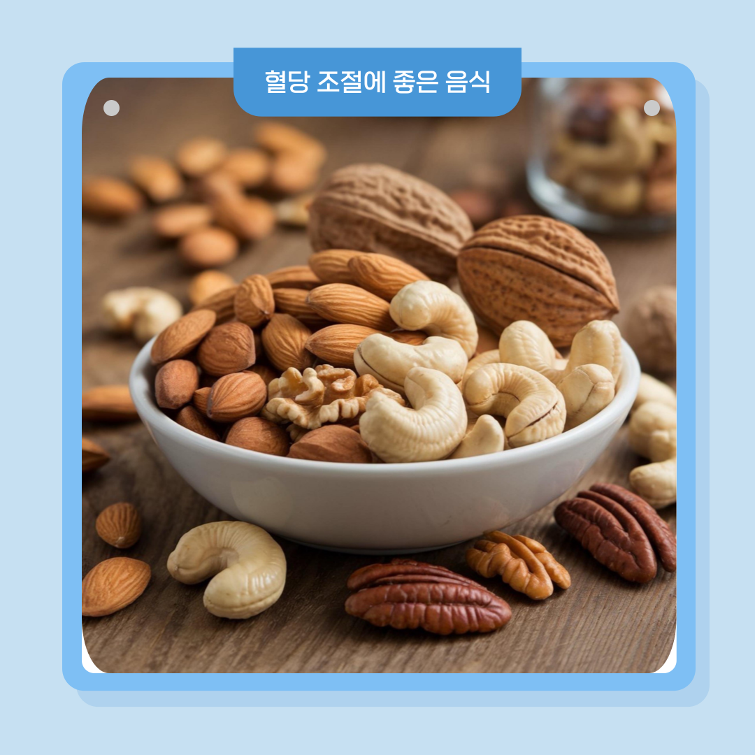 호두, 아몬드 같은 견과류와 치아씨드, 해바라기씨 같은 씨앗류에는 불포화 지방산과 미네랄이 풍부해 혈당을 안정적으로 유지하는 데 도움을 줘요.