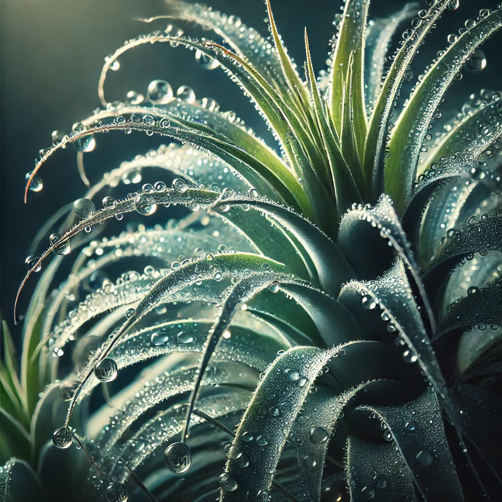 틸란드시아는 '에어플랜트'라고 불릴 만큼 흙 없이도 잘 자라는 식물이에요. 뿌리는 지지 역할만 하고, 주로 공기 중의 수분과 영양분을 잎으로 흡수합니다. 수직으로 뻗은 잎과 작은 트리콤(수분을 흡수하는 털)이 특징이며, 적절한 습도와 빛만 있으면 실내에서도 손쉽게 키울 수 있습니다.